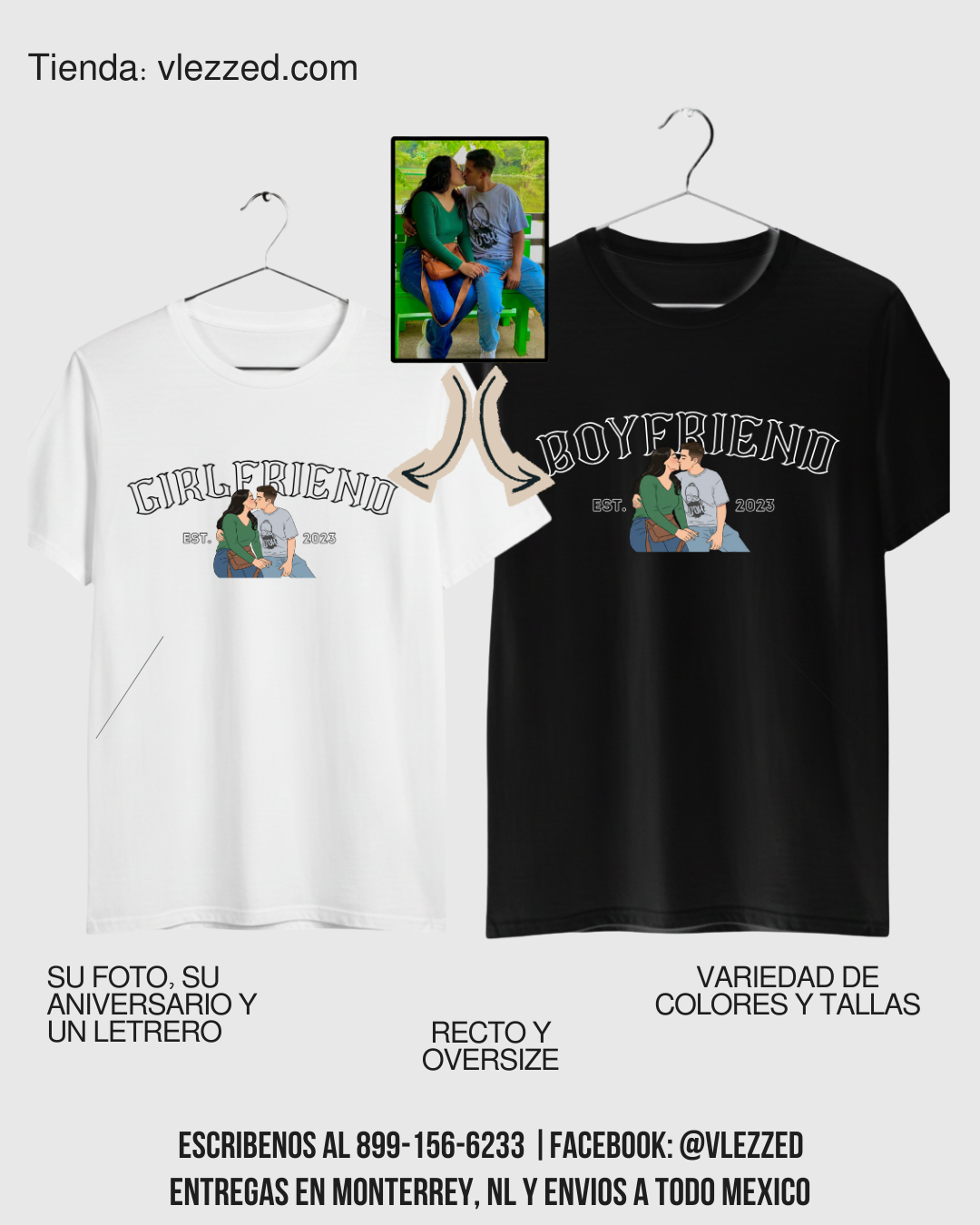 Playeras personalizadas para pareja, hechas de algodón. Disponibles en blanco y negro, con corte recto, oversize y manga larga, tallas S a XXL. Entregas en Monterrey y envíos nacionales